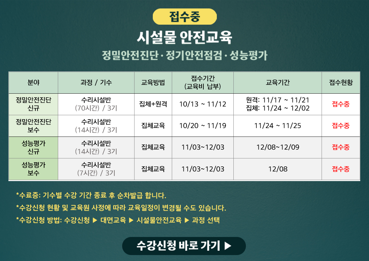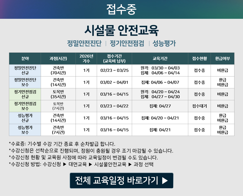 - (교육일정) 2025년 시설물 안전교육[정밀안전진단 / 정기안전점검 / 성능평가]2024-12-31