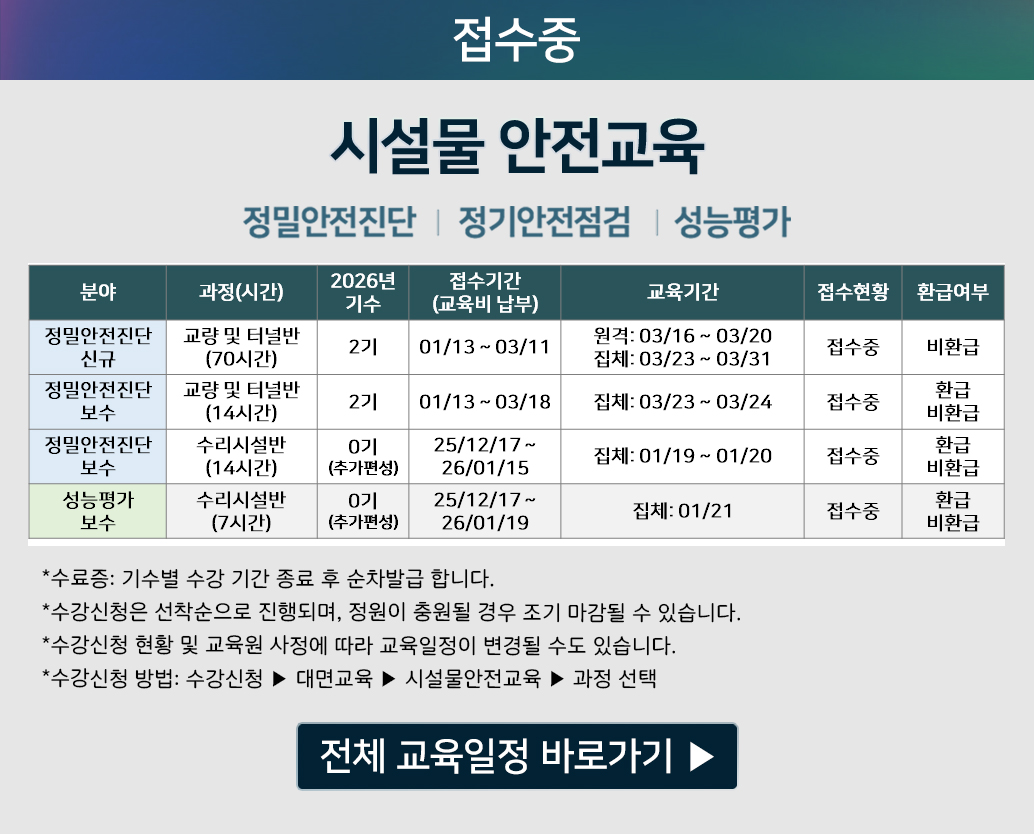 - (교육일정) 2026년 시설물 안전교육[정밀안전진단 / 정기안전점검 / 성능평가]2025-12-15